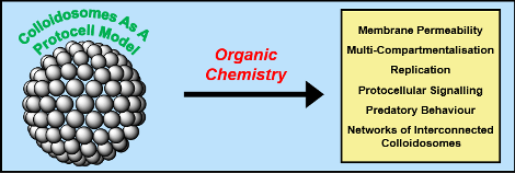 Colloidosomes are robust, versatile microcapsules that have emerged as promising candidates for protocell models. Read our just published review that highlights the role of organic chemistry in the engineering of colloidosomes with life-like behaviours, such as selective membrane permeability, adhesion, chemical signalling, dynamic multi-compartmentalisation, replication, and predation.