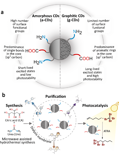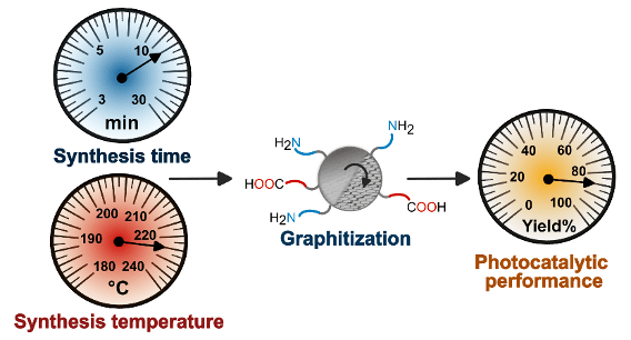 Photocatalysis is a growing field of chemistry in which carbon dots (CDs) have attracted considerable interest as an environmentally friendly alternative to conventional photocatalysts. This article demonstrates that by adjusting their synthesis time and temperature, it is possible to tune the degree of graphitization of their core. This was found to have an important effect on CD photocatalytic properties, proving that by tuning the synthesis it is possible to tune the properties of the final materials.