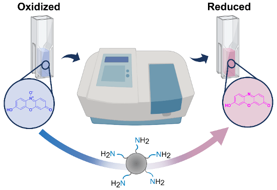 Using the resazurin-to-resorufin reduction as a well-established redox benchmark, we demonstrated that higher amine density leads to markedly superior CD redox performance — both in the dark and under light irradiation. A key mechanistic finding emerged from this analysis: electron transfer does not proceed through isolated amine groups acting independently, but relies on cooperative supramolecular interactions between the CD surface and the substrate, with multiple neighbouring amines working in concert. This cooperative mode of action had not been previously described for this class of materials.
