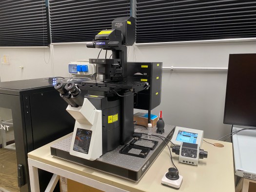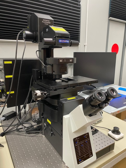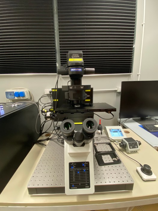 FV3000 confocal laser scanning microscope (Evident). The system is equipped with 4 excitation lasers lines: 405, 488, 561 and 640 nm (Coherent), a galvanometric scanning head and 4 spectral detectors, allowing to perform simultaneous imaging of up to 4 fluorescence channels. Brightfield images can be acquired using a scanning laser line and a transmitted light detector. The IX 83 inverted microscope body (Olympus) includes a motorised sample stage for multi-area mosaic image acquisition.